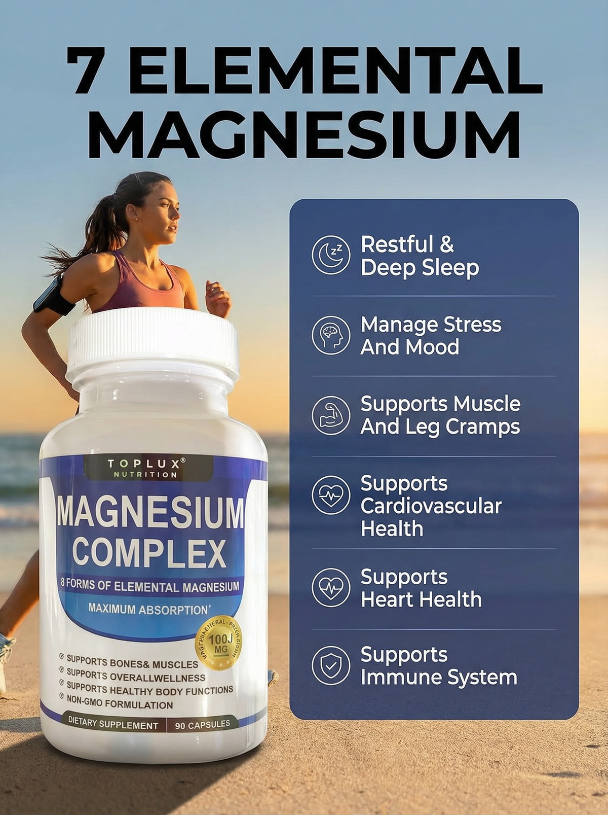 Answer 1: The magnesium complex features a blend of eight elemental types of magnesium, each chosen for their high absorption rates and benefits, supporting various bodily functions.